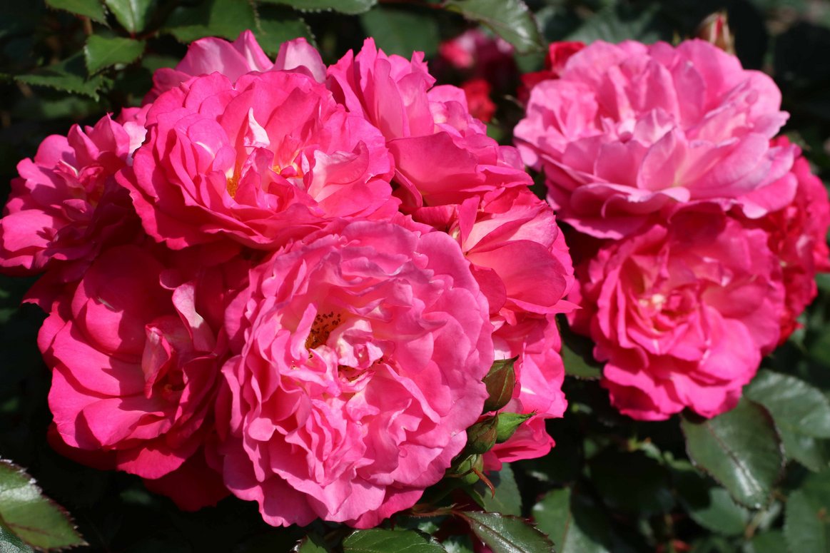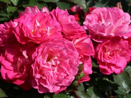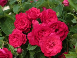 Die Strauchrose Lucky Red® (Kordes, Einführung 2026) kann durch den aufrechten Wuchs auch alleinstehend als strukturgebendes Element im Garten verwendet werden. Die Sorte zeigt ein leicht glänzendes, mittelgrünes Blatt sowie hellrote Stacheln. Der Neuaustrieb ist braunrötlich. Das strukturierte Laub erinnert dabei ein wenig an Wildrosen. Die großen magentaroten und stark gefüllten Blüten stehen in Dolden, welche sich dem Betrachter entgegen neigen. Die Sorte bildet einen überzeugenden zweiten Flor nach dem Sommerschnitt aus. Es handelt sich um einen Spätblüher, der keine Hagebutten ansetzt, und ca. 140 cm hoch und 100 cm breit wird.