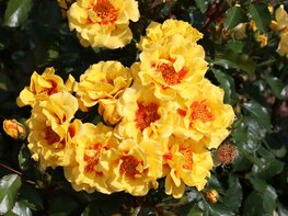 Die Beetrose Orienta® Samira (Tantau, Einführung 2027) zeigt einen halbaufrechten Wuchs, dunkelgrünes, sehr stark glänzendes Laub und einen rötlichen Neuaustrieb. Die roten Triebe weisen eine eindrucksvolle Bestachelung auf. Es handelt sich um eine Rosa persica-Hybride, die gut von Insekten beflogen wird. Die kräftig gelben Blüten mit rotem Auge stehen in Dolden, wobei immer wieder neue Blüten nachgeschoben werden. Ein leichter Duft und die gute Selbstreinigung runden den positiven Eindruck ab. Die Sorte macht auch einzelnstehend im Garten eine gute Figur. Sie blüht früh bis mittel und zeigt einen starken Hagebuttenansatz. Sie wird ca. 100 cm hoch und 70 cm breit.