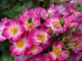 Die Zwergrose Little Susie® (Noack, Einführung 2021) zeichnet sich durch ihren breitbuschigen, niedrigen Wuchs aus, wodurch sie besonders gut zur Flächenbegrünung geeignet ist. Das stark glänzende, mittelgrüne Laub ist gering gezähnt, der Neuaustrieb hellgrün. Die Sorte zeigt kleine rote Stacheln und wirkt zierlich-verspielt. Die einfachen Schalenblüten in Dunkelrosa-violett mit weißer Mitte stehen in dichten Dolden und werden von Insekten gut besucht. Die Sorte ist ein Spätblüher mit guter Selbstreinigung, einem starken Hagebuttenansatz und hoher Blattgesundheit bis in den Herbst. Sie wird nur rund 50 cm hoch und 90 cm breit.