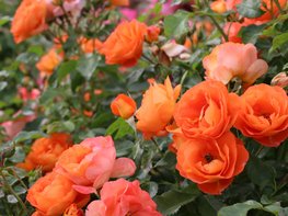 Die Strauchrose Orange Juwel® (Kordes, Einführung 2027) überzeugt mit einem buschig kompakten Wuchs. Der hellgrüne Neuaustrieb zeigt auffallend rote Blattränder; ansonsten sind die Blätter mittelgrün-glänzend und leicht gewellt. Die Blüten stehen in lockeren Dolden, wobei die Blütenstiele rötlich überhaucht sind. Die locker gefüllten, schalenförmigen Blüten leuchten in kräftig Rotorange und verblassen zu Orangerosa. Es handelt sich um einen Spätblüher, der gut von Insekten besucht wird, mit Hagebuttenansatz. Die Sorte setzt aufgrund ihres Wuchses und der auffallenden Blütenfarbe einen deutlichen Akzent im Garten. Sie wird ca. 120 cm hoch und 90 cm breit.